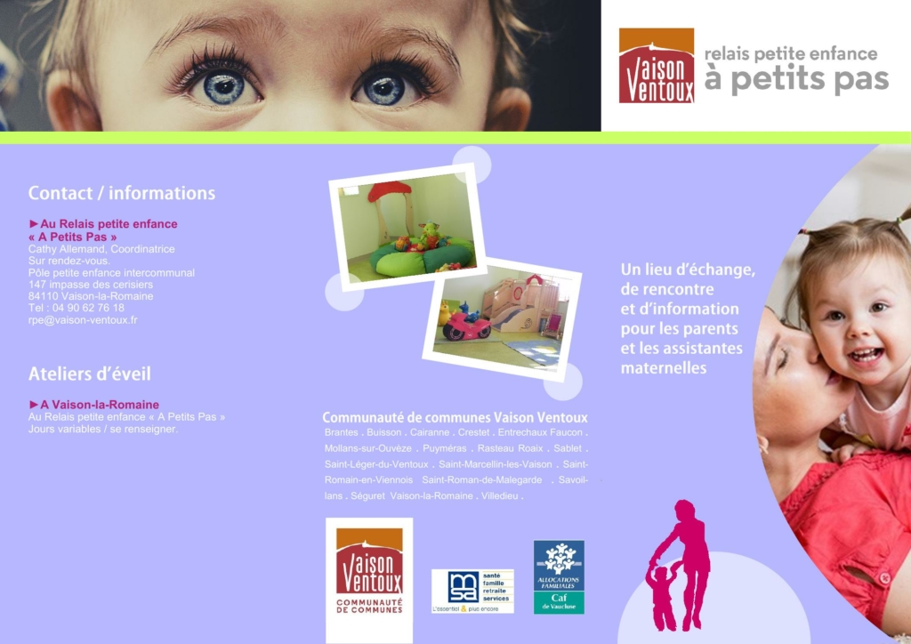> En Vaison Ventoux, Le Relais petite enfance intercommunal « A petits pas », dont Cathy Allemand est la référente, vous conseille : https://www.vaison-ventoux.fr/ova_dep/relais-petite-enfance/