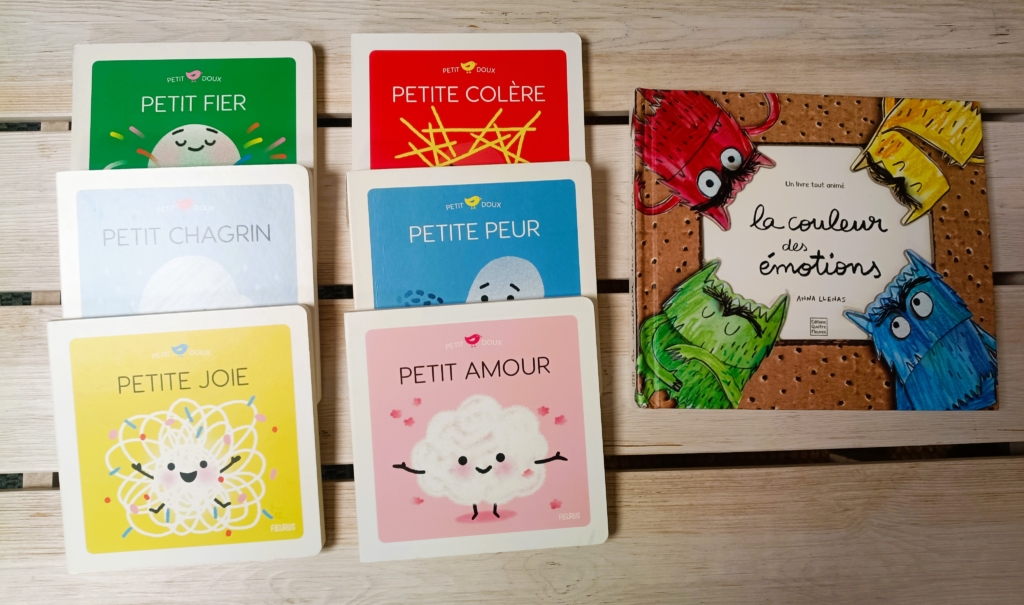 On y retrouve un petit livre pour chaque émotion : Petit amour, Petite joie, Petite colère, Petit fier, Petite Peur, Petit chagrin.