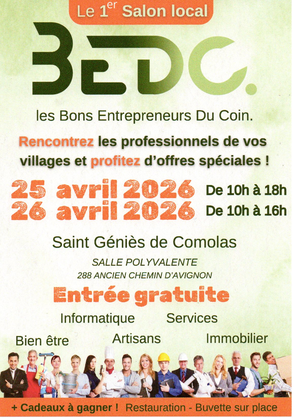 SILCONCEPT vous invite au troisième Salon BEDC le samedi 25 avril et le dimanche 26 avril 2026, salle Polyvalente à Saint Géniès de Comolas. Accueil gratuit de 10H00 à 18H00. Ce salon est organisé pour donner de la visibilité aux entreprises locales. Venez rencontrer le bon intervenant pour vos besoins et vos projets.