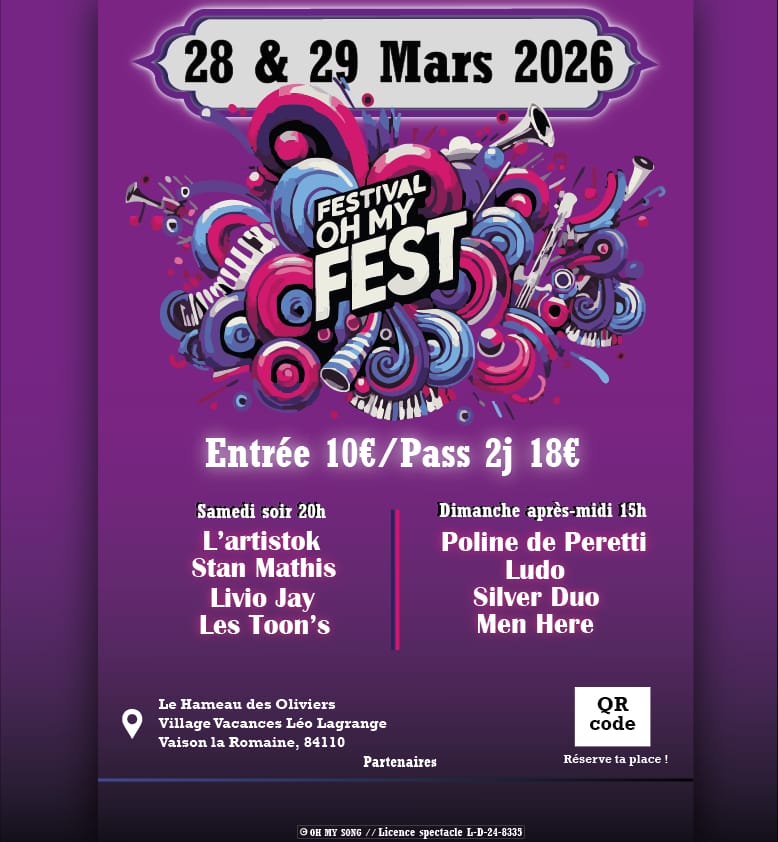 L’association orangeoise « Oh my Song » organise le festival « Oh my Fest » à Vaison-La-Romaine les samedi 28 et dimanche 29 mars 2026, son deuxième festival consacré à la musique. Entre une ambiance pop-rock le samedi soir et un dimanche après midi consacré à la chanson française, il y en aura pour tous les goûts.